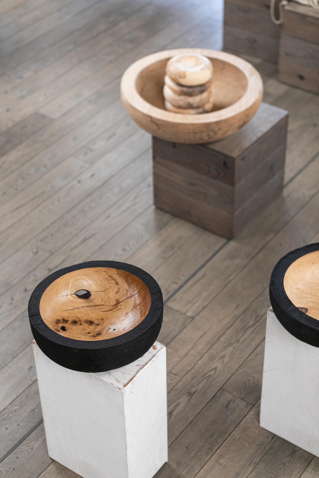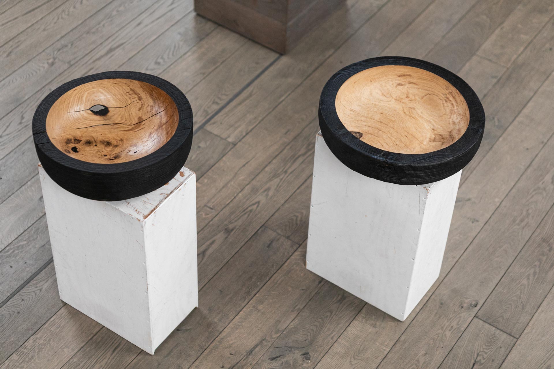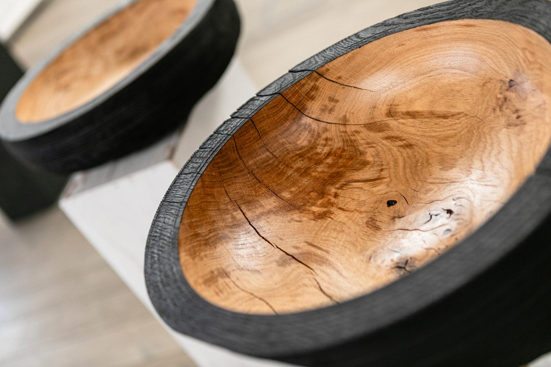 Noir d’Or from the Vanguard collection, handcrafted from an elm crotch spanning 39 cm in diameter, reveals an absolutely stunning maze of knots and grain patterns in its warm, golden interior contrasting the bold black exterior shell. A cute hole bridges the outer and inner worlds, creating instant visual drama that stands out in exhibitions and interiors alike. As a commanding sculptural presence, it anchors open-plan spaces on low sideboards or acts as a visual hinge between zones — holding nothing yet full of presence, or evolving into a vessel for heirlooms and intentions.